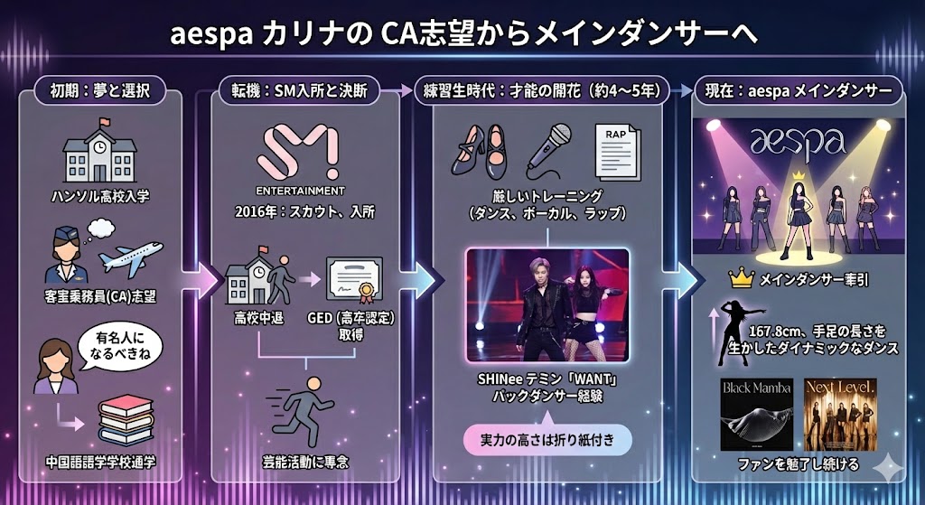 多くのK-POPアイドルが幼少期から有名なダンススクールに通うケースが多い中、カリナさんの経歴は少し特殊です。